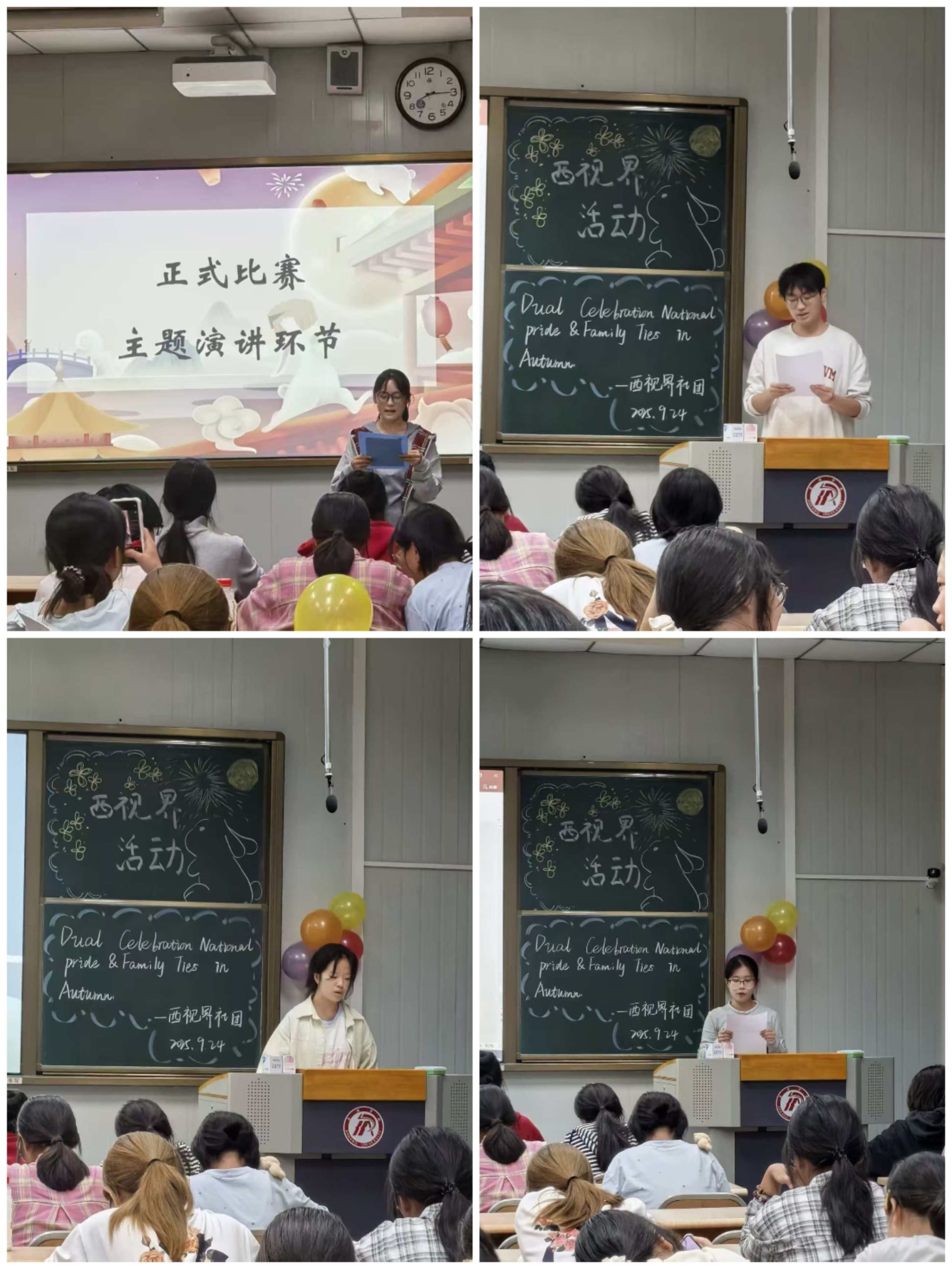 在主题演讲环节,同学们以流畅的英语分享了各自珍贵的“家国记忆”,从国庆观旗的澎湃心潮到中秋团圆的温馨时刻,真挚的叙述引发了全场深刻共鸣。文化对话则将视角延伸至更广阔的文明图景。通过对比中秋、国庆与西方节日的文化内涵,同学们在差异中探寻共性,在对比中深化理解。这一环节既拓展了同学们的国际视野,更坚定了大家的文化自信,深刻体现了外语人“融通中外”的学术使命与桥梁作用。